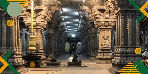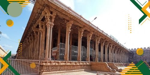 TA magnificent thousand-pillared hall inside the Srirangam temple complex, known for its detailed stone carvings and grand Dravidian architecture reflecting ancient craftsmanship and heritage.